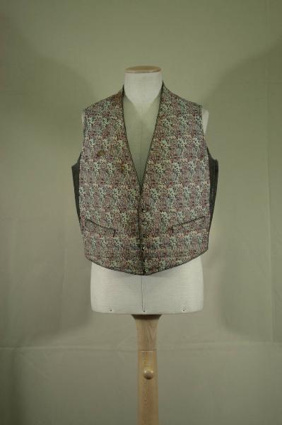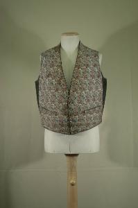 Gilet maschile a un petto, chiuso da sei bottoni inmetallo e con parte centrale in pasta vitrea ad imitazione turchese e altrettanti occhielli; scollo a V doppio petto e due tasche con patte cucite. E' confezionato in taffetas bianco lanciato in lana azzurra, rossa e nera che forma un decoro di gusto esotico, definito da pagode e fiori stilizzati, disposti a scacchiera. Lo scollo e gli orli sono rifiniti con una fettuccia in seta. Dorso in due pezzi con cinturino e pinces e tasselli triangolare ai fianchi in tela cerata marrone. Fodera in tela di cotone écru imbottito.
