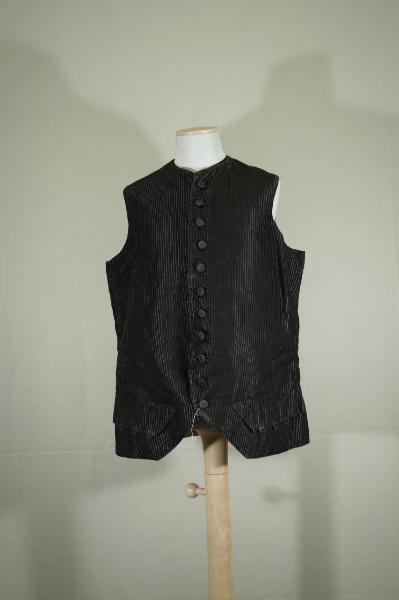 Gilet maschile a un petto, scollo a girocollo, undici occhielli e altrettanti bottoni rivestiti in tessuto, core falde sfuggenti su cui sono due tasche con patte decorate da quattro tasche. E' confezionato in velluto nero riccio, decorato da coste verticali intervallate da costine liserè nocciola. Dorso in due pezzi con spacco centrale in tela cerata marrone. Foderate in tela di lino ècru e in diagonale di seta marrone lungo l'allacciatura e l'orlo..
