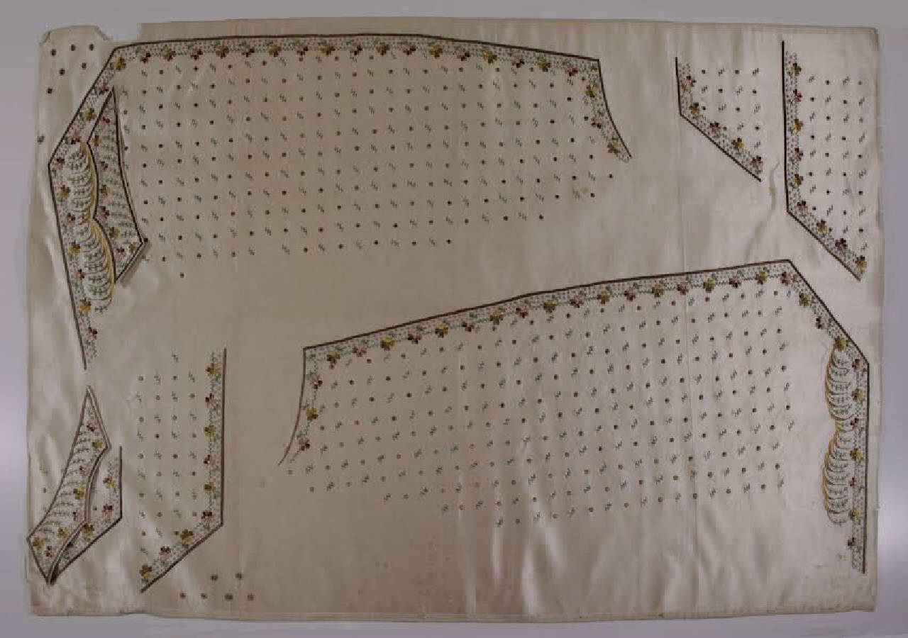 telo in raso avorio ricamato in seta policroma definendo l'abbottonatura, l'alto collo, le patte delle tasche e i bottoni di un gilé. Il decoro è definito da piccoli fiori stilizzati. Le due patte sagomate sono state tagliate e ricucite sul telo.