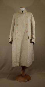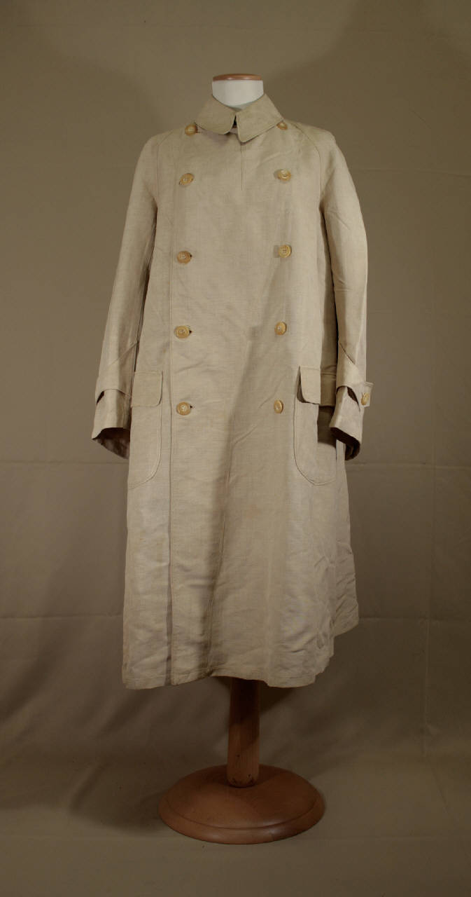 Soprabito in tela di lino écru doppiopetto, linea a trapezio, con dieci bottoni, due tasche applicate con patta, maniche raglan lunghe in tre pezzi con un pannello cucito al polso che si può stringere grazie a due bottoni; cucitura al centro, sul retro, terminante con uno spacco. Collo a camicia chiuso da un gancio. Privo di fodera. Etichetta cucita sul rovescio.
