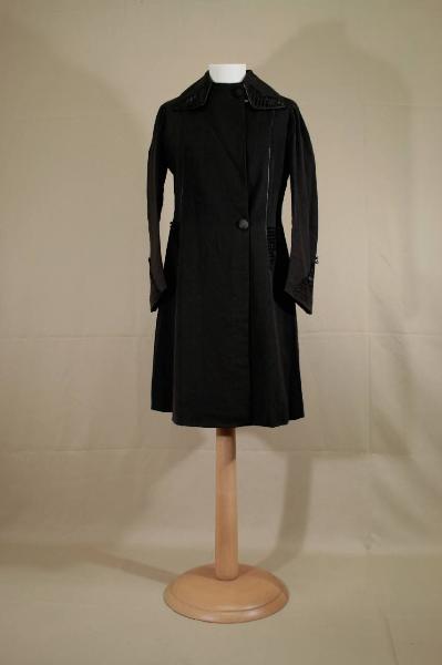 Soprabito in jersey nero, dalla linea dritta, ad un petto, chiuso da due grandi bottoni sivestiti in tessuto; collo bavero decorato da fettucce in seta nera, disposte sul late anteriore e a bordare il collo stesso. Le identiche fettucce rifiniscono il soprabito sul petto, fino ai fianchi, lungo la cuciura dei fianchi, sino all'orlo, e sul fianchetto posteriore, sui fianchi e sull'orlo della manica sono disposte a formare un pannello triangolare. Manica lunga dritta in due pezzi. Fodera in seta nera rigata in verde, rosso, giallo e blu. Etichetta applicata sulla fodera.