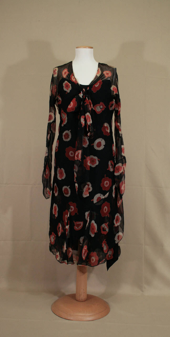 Abito lungo in chiffon nero decorato da rose bianche e rosse stampate, con scollo a V da cui si origina una banda pieghettata da annodare, maniche lunghe a chimono con tassello, che terminano con alto polso ripiegato; taglio sotto al seno che prosegue sul dorso, con scollo a girocollo, gonna dritta, movimentata all'orlo da voulant doppio disposto in diagonale e, posteriormente, da un voulant cucito al centro. L'abito è doppiato con una sottoveste in crespo nero, con scollo a sottoabito velato di chifonn carne.