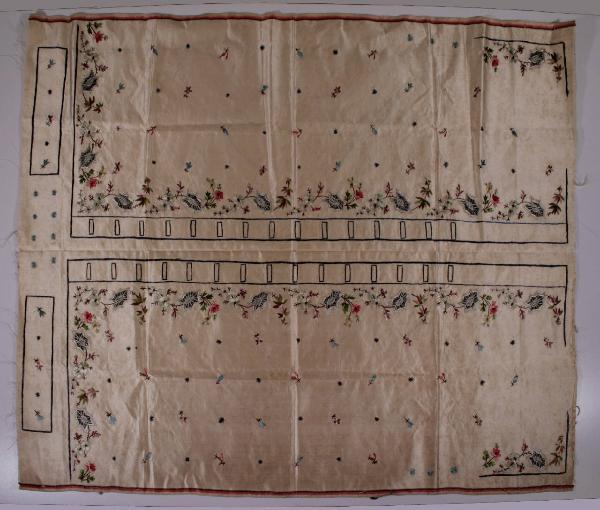 telo in raso avorio ricamato in seta policroma definendo l'abbottonatura, il collo a cinturino, le patte delle tasche e i bottoni di un gilé. Il decoro è definito da elementi floreali stilizzati. Al tessuto è unito parte di una carta da gioco.