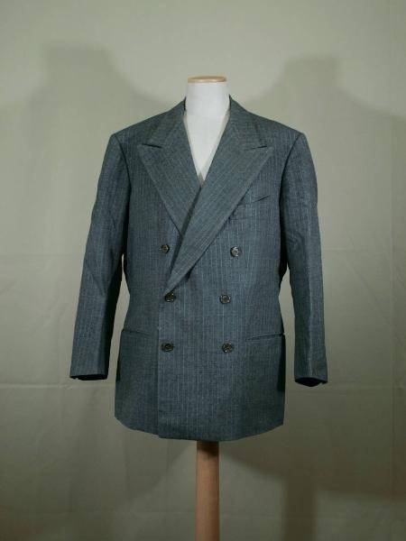 Completo composta da giacca, pantaloni e gilé in diagonale di lana grigio rigato di giallo . Giacca doppipetto, 6 bottoni e 4 occhielli, collo con risvolti a lancia con occhiello, modellata da pinces, due tasche a filetto e taschino con patta cucita; dorso con cucitura centrale. Maniche in due pezzi con spacco sulla manica con 4 bottoni e altrettanti occhielli. Fodera in diagonale di seta grigia e maniche in taffeas bianco rigato in giallo. Tasca interno con filetto e patta (entro cui è l'etichetta) e spalle imbottite. Gilé ad un petto, chiuso da 5 bottoni e 5 occhielli, con quattro tasche con patta cucita, modellato da pinces, dorso in due pezzi con cucitura centrale che termina con spacco e cinturino in diagonale di seta grigio (sul cinturino è applicata l'etichetta); fodera in diagonale di cotone bianco stampato a righe. Pantalone lungo classico con risvolto, con cintura e passanti, 4 pinces aperte, tasche inserite nella cucitura dei fianchi ed uno a sinistra, all'altezza della vita; chiusura nascosta mediante patta dove sono quattro bottoni e altrettanti occhielli e un gancio; altri due bottoni sulla cintura; sul dietro pinces chiuse e due tasche a filetto. Etichetta applicata sulla fodera della tasca; sulla cintura, rinforzata con un nastro bianco, sono cuciti sei bottoni.