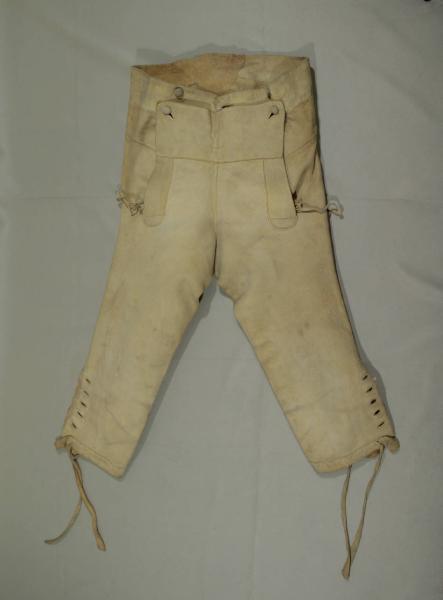 Calzoni in pelle scamosciata avorio. Alta cintura sagomata con due tasche con patta cucita, patta alla marinara, con apertura centrale anteriore verticale, chiusa da cinque bottoni, la patta è abbottonata mediante tre bottoni. La cintura prosegue sul dorso dove, accoglie due bottoni e un cinturino chiuso da un bottone; gherone al centro. Ogni calzone è fermato al ginocchio da cinque bottoni, con altrettanti occhelli, e da un cinturino con fettucce sempre in pelle.