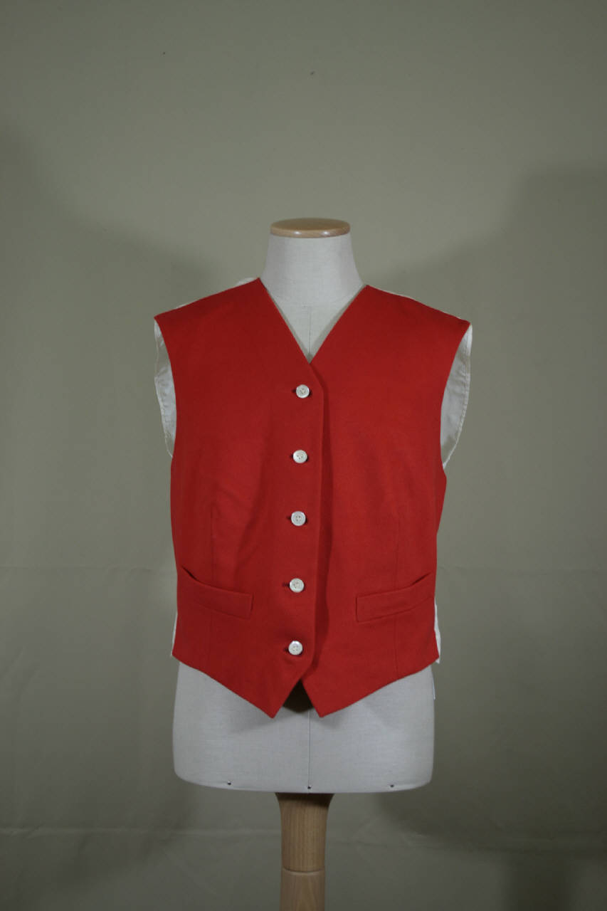 Gilé in panno rosso, ad un petto, chiuso da cinque bottoni e cinque occhielli, con due tasche con patta cucita, modellato da pinces, dorso in un pezzo con cinturino con fibia metallica in taffetas avorio, impiegato anche per la fodera.