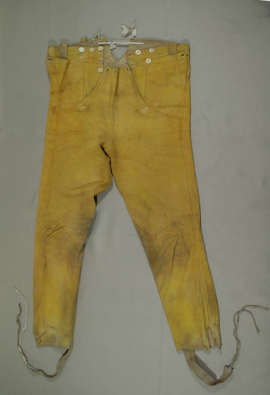 Pantaloni in pelle scamosciata gialla. Alta cintura sagomata con grandi passanti, forse aggiunti in un secondo momento, patta alla marinara, con apertura centrale anteriore verticale, chiusa da tre bottoni, la patta è abbottonata mediante tre bottoni. La cintura prosegue sul dorso dove, accoglie due bottoni e spacco centrale. Il fondo dei pantaloni presenta uno spacco con occhielli e porta il sottopiede definito da una fettuccia. I pantaloni sono privi della cucitura interna.