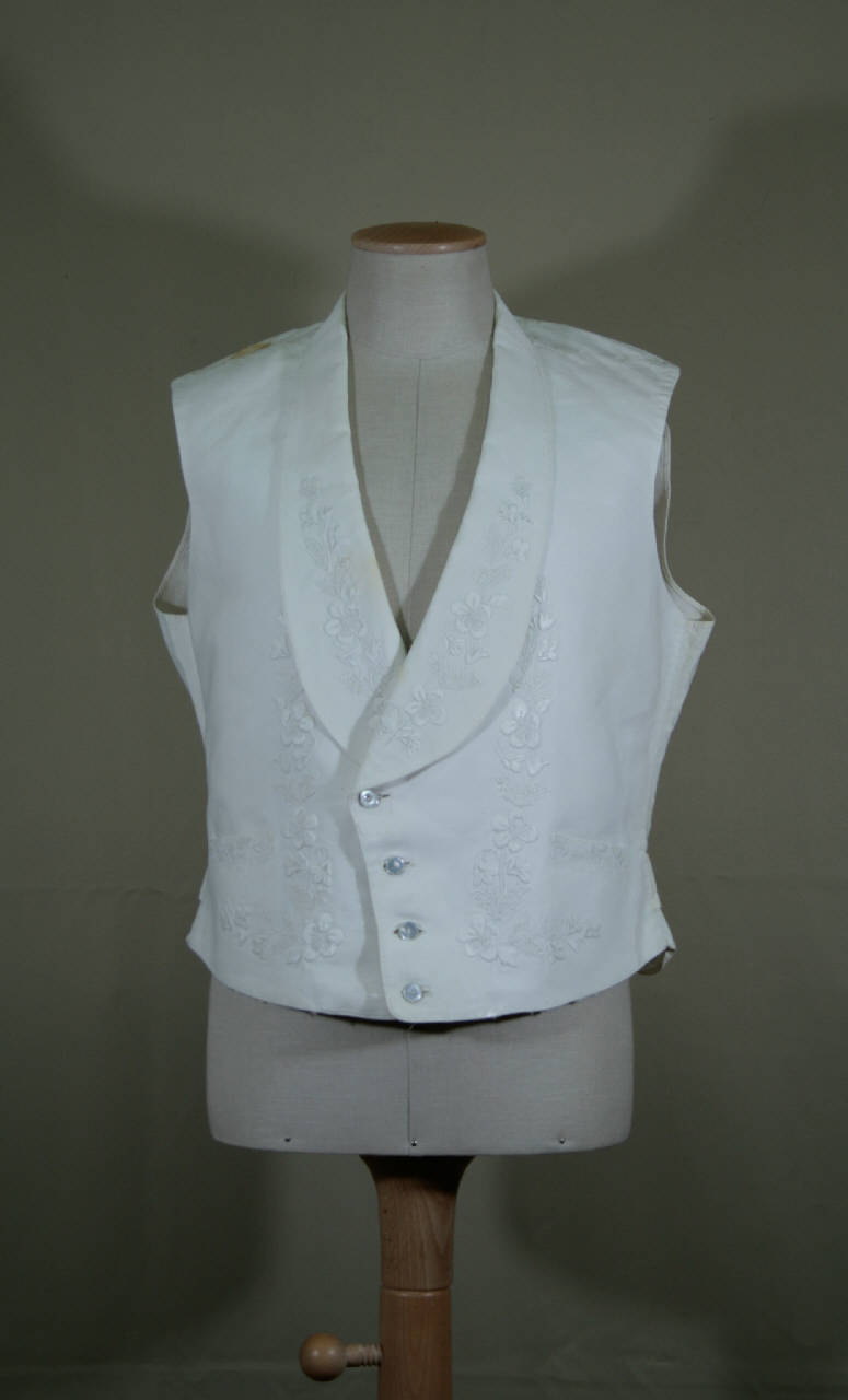 Gilè tagliato all'altezza della vita, a un petto, con quattro occhielli e altrettanti bottoni disposti in diagonale, collo sciallato, coppia di tasche con patta cucita. E' confezionato in tpiquet di cotone bianco ricamato in cotone bianco lungo il collo, l'abbottonatura, l'orlo e le patte un sottile tralcio fiorito. Dorso in un pezzo con cinturino in metallo confezionato in tela bianca. Fodera in tela bianca solo per il dorso.