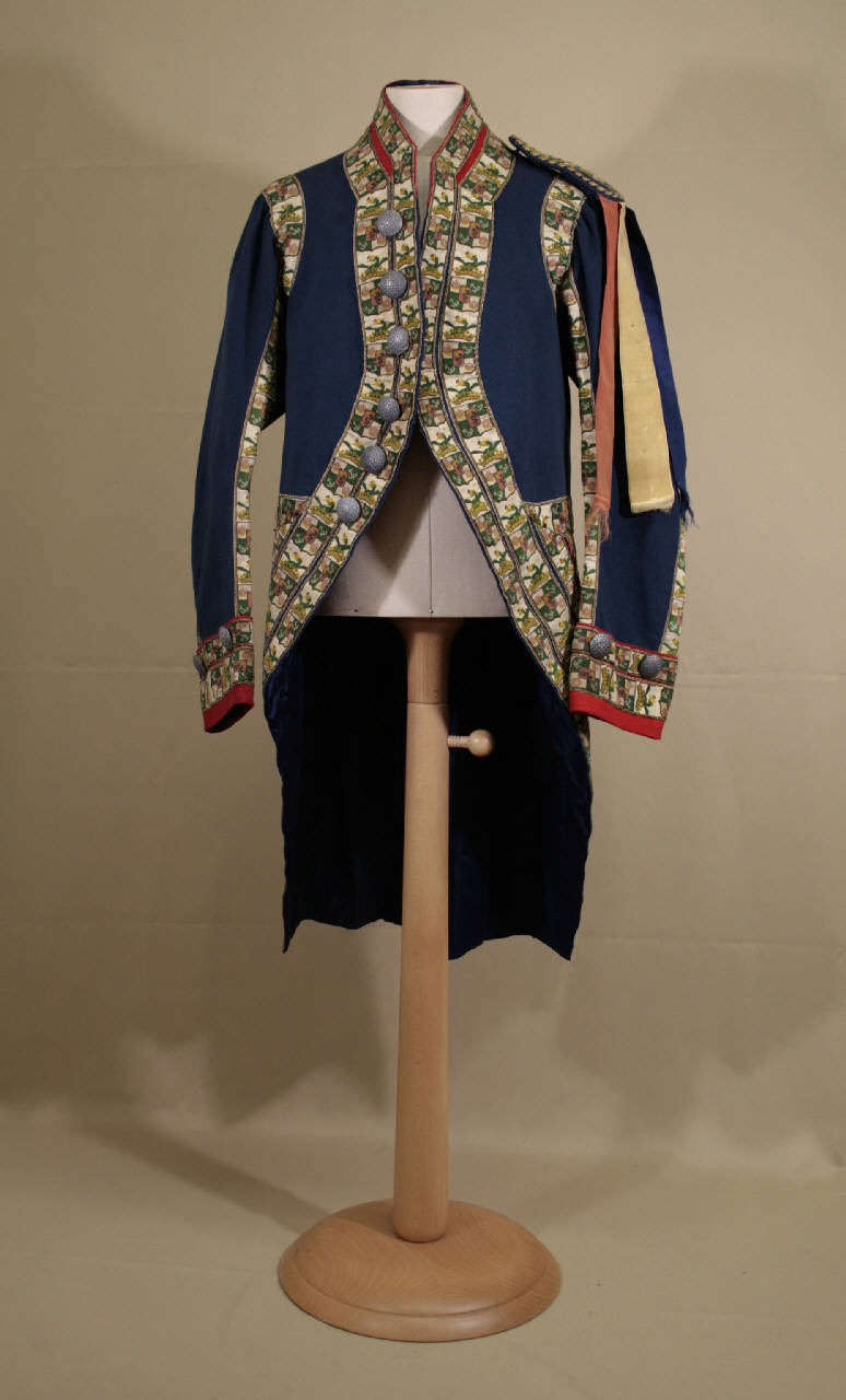 Livrea confezionata in panno azzurro, rifinita con galloni in velluto decorati con stemmi. Alto colletto a fascia in panno rosso, mostre molto sfuggenti dove sono sei bottoni non funzionali decorati con un motivo a canestro in metallo argentato, l'allacciatura è data da un gancio; patta in panno rosso sagomata. Falde che si riuniscono posteriormente in piegoni fermat che nascondono una tascai e spacco centrale, punto vita segnato da due bottoni. Maniche in due pezzi dritta, dove corrono galloni disposti sulle cuciture e a decorare il polso in panno rosso, con due bottoni. Fodera in diagonale di seta blu, maniche in tela di lino bianco. Spallina sagomata, su cui è applicato il gallone ebordata da un cordone in seta, regge tre nastri in velluto riccio, nei colori del blu, rosso e crema.