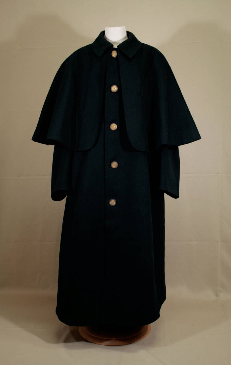 Lungo soprabito in panno ad un petto, chiuso da cinque bottoni in metallo fuso con stemma gentilizio e altrettanti occhielli, un bavero a mantellina e colletto semplice, lineasvasata. Dorso in un pezzo, maniche Livrea confezionata in panno nero, collo con reversi, mostre dritte dove sono falde che si riuniscono posteriormente in piegoni fermati e spacco centrale, punto vita segnato din due pezzi dritte. Fodera in diagonale di lana verde e in tela incerata marrone per le maniche. Nella fodera è inserita una tasca, sul lato sinistro.