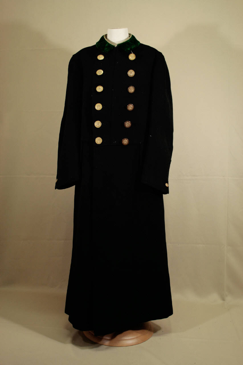 Soprabito svasato in panno nero, collo, in velluto verde e con cinturino in raso a righe gialle e verdi, con reversi, doppiopetto con dodici bottoni in metallo fuso con stemma gentilizio e altrettanti occhielli, taglio in vita, segnato da due patta rettangolere, da cui partono le lunghe falde che si riuniscono posteriormente in piegoni fermati che celano tasche segnate da patte dritte segnate da un bottone, e spacco centrale, punto vita segnato da due bottoni. Maniche in due pezzi dritta, con spaco al polso fermato da un botton. Fodera in diagonale di lana (ordito bianco e marrone, trama verde) e in tela di cotone bianco per le maniche e per lo sprone in diagonale di cotone color oliva; sul lato sinistro è una tasca a filetto.