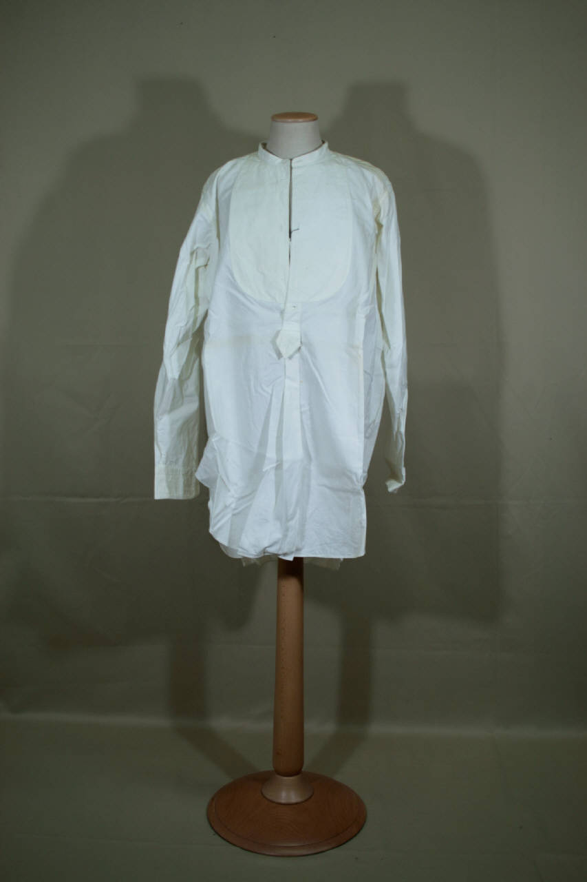 Camicia maschile in tela bianca con collo a cinturino con tre occhielli, sprarato inamidato data da due occhielli e abbottonatura parziale definita da un occhiello e un bottone, terminante con un piccolo cappio sagomato con asola e pieghe piatte; piccolo sprone sul retro su cui è applicato un passante e da cui partonodue pieghe piatte. Orlo dei fianchi stondati. Maniche lunghe con gherone e polsino con due occhielli e spacco.