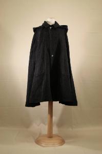 Mantello svasato corto, in panno nero, lungo, con colletto a camicia chiuso da un gancio e impunturato; abbottontura completa a nteriore definita da quattr occhielli e due bottoni; linea molto svasata; dorso in un pezzo. Cappuccio staccabile e unito al mantello mediante quattro bottoni e altrettanti occhielli. Sul rovesciosono applicte due tasche sagomate.