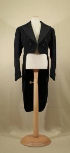 Giacca in panno nero, con collo con risvolti a lancia con occhielli, sei bottoni rivestiti con fili di seta nera disposti in diagonale; taglio in vita da cui parte la falda che continua posteriormente con la foggia "a coda di rondine", unendosi sul dorso contraddistinto da tagli, che celano una tasca, e dalla cucitura centrale con spacco; due bottoni segnano il punto vita. Maniche in due pezzi con spacco al polso e quattro bottini. Tasca interna a filetto dove è cucita l'etichetta. Fodera in diagonale di seta nera e per le maniche in diagonale crema.