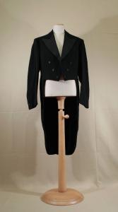 Completo in diagonale nero composto da una giacca-frac e un paio di pantaloni. Giacca con collo con risvolti a lancia con occhielli, sei bottoni rivestiti in filo di seta nera disposti in diagonale, tasca sul petto con patta cucita dritta; taglio in vita da cui parte la falda che continua posteriormente con la foggia "a coda di rondine" unendosi sul dorso contraddistinto da tagli e dalla cucitura centrale con spacco; due bottoni segnano il punto vita; spalle imbottite, maniche in due pezzi con polso con spacco chiuso da quattro bottini; tasca interna a filetto dove è cucita l'etichetta; fodera in raso di seta nero e per le maniche in taffetas avorio. Pantaloni lunghi classici, cintura in vita, da cui partono quattro pieghe aperte, tasche inserite nella cucitura dei fianchi sottolineata da una fettuccia in seta nera; chiusura nascosta mediante patta dove sono cinque bottoni e altrettanti occhielli; altri due bottoni sono all'altezza della vita; sul dorso quattro pinces chiuse e due tasche a filetto chiuse da bottone. Sula fodera della cintura in raso di seta bianco sono cuciti sei bottoni; sulla fodera della tasca è cucita l'etichetta