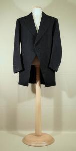 Completo composto da una giacca-frac e un paio di pantaloni. Giacca in diagonale nero con collo con risvolti a lancia con occhiello, un bottone e un occhiello, tasca sul petto con patta cucita dritta; taglio in vita da cui parte la falda che continua posteriormente con la foggia "a coda di rondine" unendosi sul dorso contraddistinto da tagli e dalla cucitura centrale con spacco; due bottoni segnano il punto vita; spalle imbottite, maniche in due pezzi con polso con spacco chiuso da quattro bottini; tasca interna a filetto dove è cucita l'etichetta; fodera in diagonale di seta nero e per le maniche in taffetas avorio; all'altezza del petto la fodera è imbottita. Pantaloni lunghi classici, confezionati in spigato di lana, nelle totalità del grigio, bianco e nero, decorato da un motivo a righe, con cintura in vita, da cui partono quattro pieghe aperte, tasche inserite nella cucitura dei fianchi; chiusura nascosta mediante patta dove sono cinque bottoni e altrettanti occhielli e un gancio; sul dorso quattro pinces chiuse e due tasche a filetto chiuse da bottone. Sula fodera della cintura in taffetas rigato (avorio, rosa e azzurro) sono cuciti sei bottoni; sulla fodera della tasca è cucita l'etichetta.