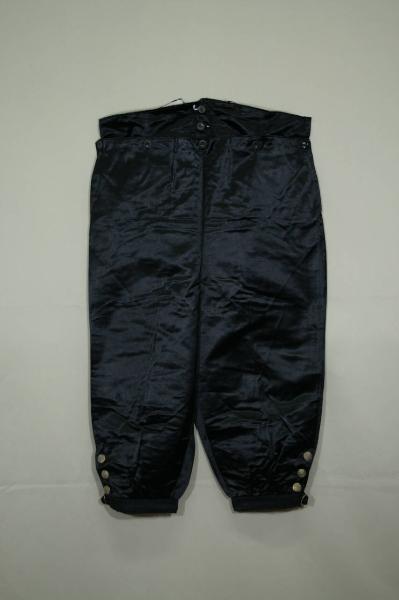 Calzoni in raso nero, con alta cintura sagomata con bottoni per le bretelle (ne rimangono solo due), patta alla marinara chiusa da cinque bottoni, con apertura centrale anteriore verticale, chiusa da cinque bottoni; una tasche inserita nella cucitura della cintura. La cintura prosegue sul dorso con spacco al centro e cintura con fibia metallica; dorso modellato da due coppia di pinces. Ogni calzone è fermato al ginocchio da tre bottoni in metallo con stemma con altrettanti occhelli, e da un cinturino con fibbia. Il cinturino e formato da un un gallone nero. Doppiato in diagonale di cotone grigio e per la patta in diagonale nero.