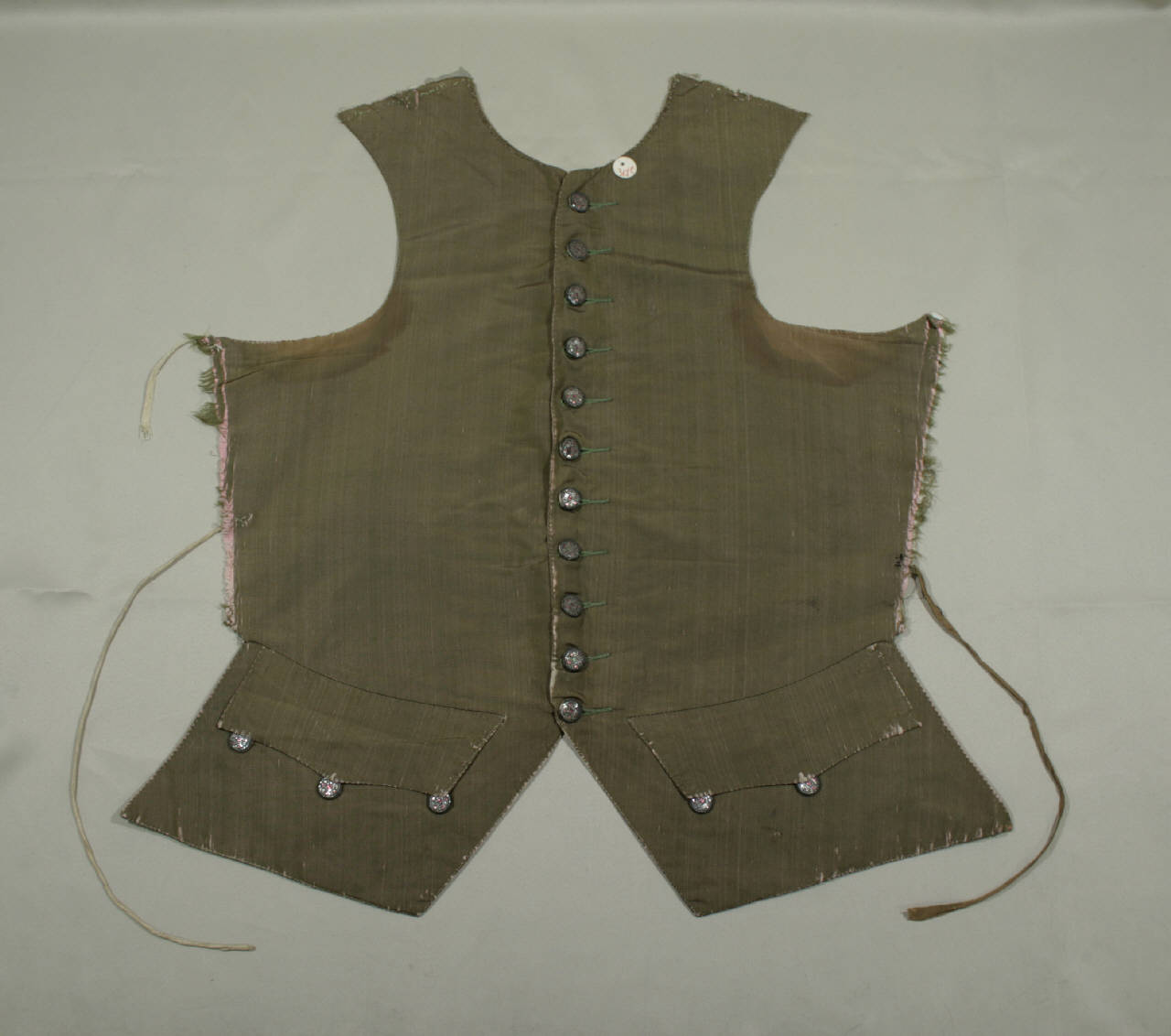 Due quarti anteriori di un gilè, scollo a girocollo, abbottonatura data da undici bottoni ricmati con paillettes e canutiglia e altrettani occhielli funzionali; falde sfuggenti verso il dorso con tasca con patta sagomata e decorata da tre bottoni. Fodera in taffetas cangiante (trama rosa e ordito verde) e in tela di lino écru.