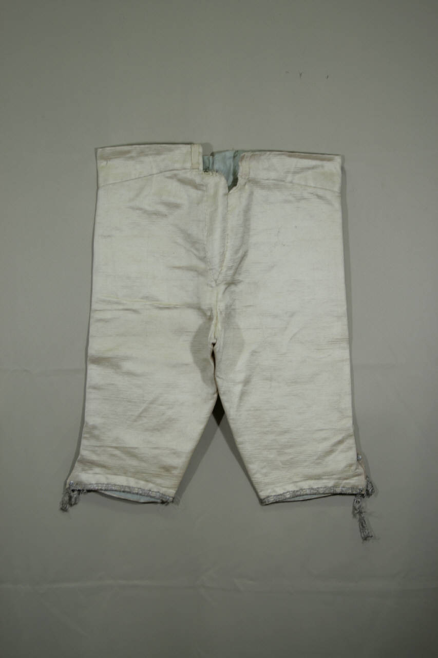 Calzoni in raso avorio (ordito in seta e trama in cotone), con alta cintura sagomata con passanti, abbottonatura nascosta data da patta verticale chiusa da due automatici e un bottone con occhiello. La cintura prosegue sul dorso con spacco al centro. Ogni calzone è fermato al ginocchio da due automatici ed è decorato da una coppia di bottoni non funzionali rivestiti in tessuto; il cinturino è rifinito con un gallone in argento filato. I calzoni sono rifiniti in diagonale di cotone azzurro.