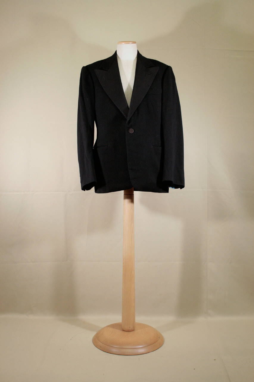 Giacca monopetto i panno nero, chiuso da un bottone doppio rivestito in fili di seta e un occhiello, collo con risvolti a lancia rivestiti in diagonale nero con un occhiello, modellata da pinces, due tasche a filetto e una con patta rettangolare cucita; dorso con cucitura centrale; spalle imbottite; maniche in due pezzi con spacco sulla manica con un bottone occhiello. Fodera in raso nero e per le maniche in taffetas avorio; tasche interna con filetto.