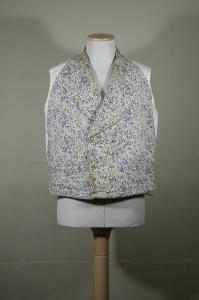 Gilè tagliato all'altezza della vita, doppiopetto, con cinque occhielli edieci bottoni in metallo, collo con risvolti, tre tasche con patta cucita. E' confezionato con diagonale di lana avorio decorata cpn un motivo a lambicchi e tralci fioriti, realizzati con trame supplementari in lana (blu e amaranto) e seta (crema); il tessuto è impiegato ruotato di 180°. Dorso in tela di lino écru in un pezzo con cinturino con fibbia metallica. I quarti anteriori sono doppiati in tela di lino che trattiene una imbottitura.