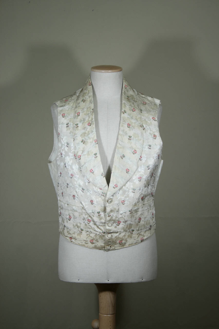 Gilè tagliato all'altezza della vita, ad un petto, con cinque occhielli e altrettanti bottoni rivestiti in tessuto, collo sciallato, due tasche con patta cucita. E' confezionato in damasco di seta avorio: sul fondo in gros si stagliano ricutvi rami fioriti e fronzuti, eseguiti in raso e con dettagli in trame di seta rosa, verde e marrone. Dorso in tela di lino écru in un pezzo con cinturino con tre coppie di occhielli metallici dove passa una fettuccia. I quarti anteriori sono doppiati in tela di lino.