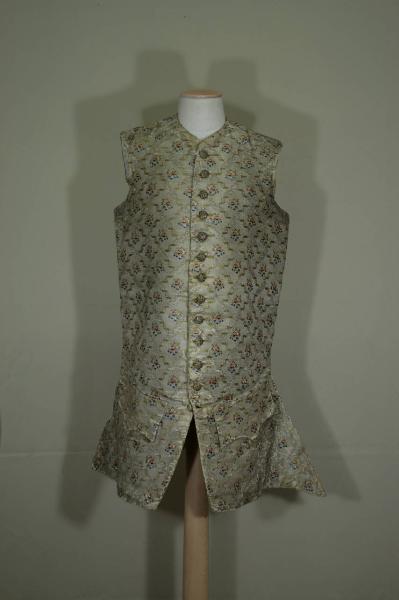 Gilet confezionato in lampasso fondo avorio laminato in oro, decorato da una griglia definita da nastri policromi che definiscono maglie irregolari che racchiudono rameti fioriti in seta policroma e argento lamellare e filato, ottenute da trame supplementari lanciate e broccate. Scollo a girocollo, mostre sagomate dove sono tredici bottoni ricamati in oro filato e canutiglia e altrettanti occhielli funzionali. Tasca con patta sagomata e decorata da tre botttoni. Lunghe falde scampanate posteriormente. Dorso in taffetas giallo in due pezzi, quasi completamente aperta e chiusa da quattro coppie di fettucce. Gheroni ai fianchi, all'altezza della pala. Fodera in taffetas e diagonale di seta écru, con integrazioni di tela di cotone.