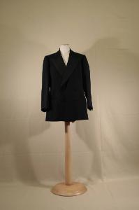 Completo composto da giacca e pantaloni in tela di lana nera. Giacca doppiopetto, chiuso quattro bottoni rivestiti in fili di seta e altrettanti occhiell, collo co risvolti a lancia rivestito in cannetttato nero e co occhiello, modellata da pinces, due tasche a filetto e una con patta rettangolare cucita; dorso con cucitura centrale; spalle imbottite; maniche in due pezzi con spacco sulla manica con quattro bottoni e altrettanti occhielli. Fodera in raso nero e per le maniche in taffetas avorio; tasca interna con filetto dove è applicata l'etichetta. Pantalone lungo classico, con cintura, 4 pinces aperte, tasche inserite nella cucitura dei fianchi sottolineati da da un nastro in seta nera; chiusura nascosta mediante patta dove sono quattro bottoni e altrettanti occhielli; un altro bottone è sulla cintura; sul dietro spacco in vita, pinces chiuse. Sulla cintura sono applicati sei bottoni. Cintura foderata in raso di cotone nero. L'etichetta è cucita sulla fodera delle tasche.