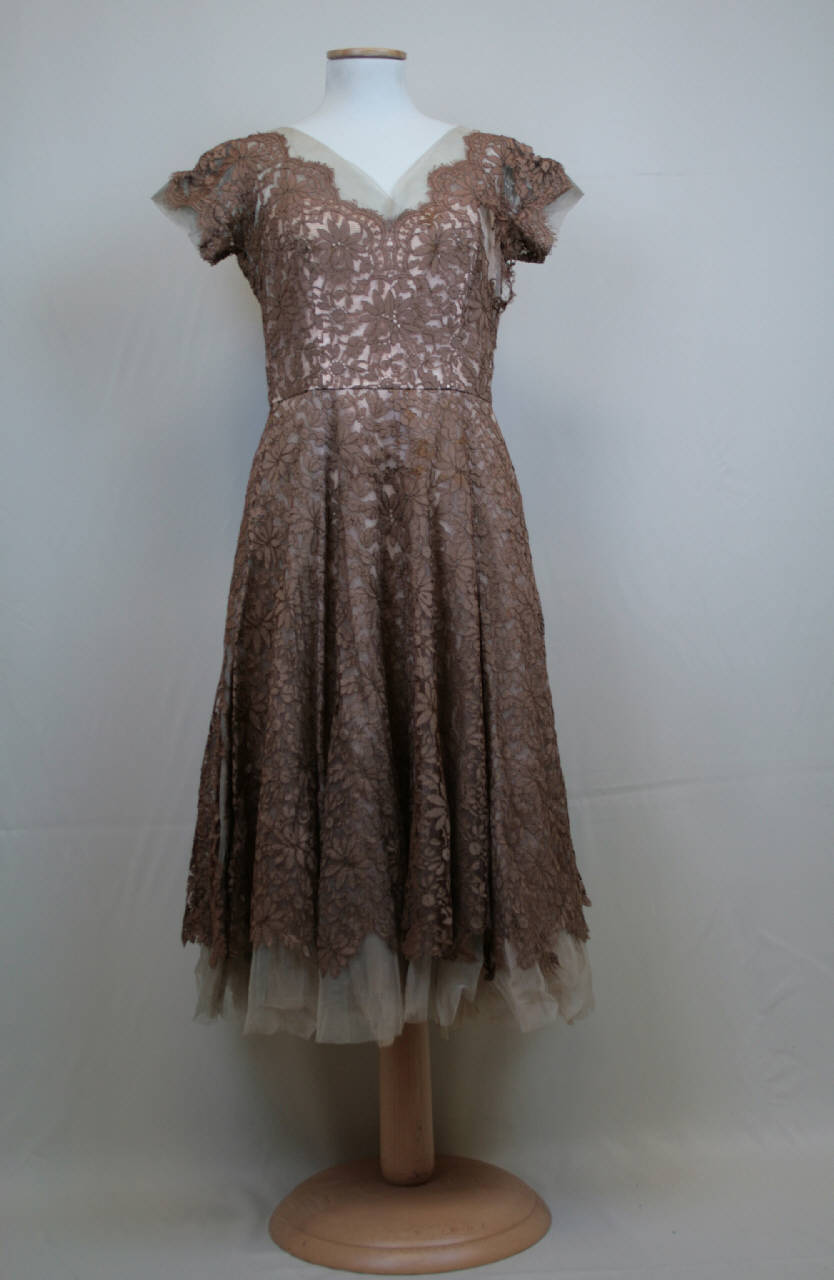 Abito in un pezzo, con corpino modellato da tagli, scollo a V; maniche corte a chimono, taglio in vita da cui parte l'ampia gonna a mezza ruota con orlo al polpaccio. L'abito è confezionato in pizzo marrone decorato con motivi floreali, doppiato in tulle beige; fodera con corpino con scollo cuore e sottogonna in taffetas sintetico crema, la sottogonna presenta all'orlo una balza arricciata. Chiusura definita da una cernierainserita nella cucitura centrale posteriore e da tre coppie di ganci.