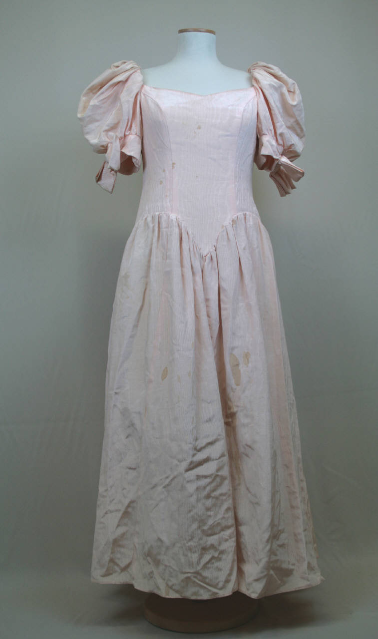 Abito lungo in un pezzo in taffetas rosa, corpino modellato da tagli, con scollo cuore, maniche corte a palloncino, decorate da un piccolo fiocco; taglio ai fianchi ad andamento a zig-zag a cui si unisce l'ampia gonna arricciata. Le maniche sono doppiate con lo stesso taffetas; sottogonna in taffetas bianco con alta balza in tulle. Chiusura definita da una cernierainserita nella cucitura centrale posteriore.