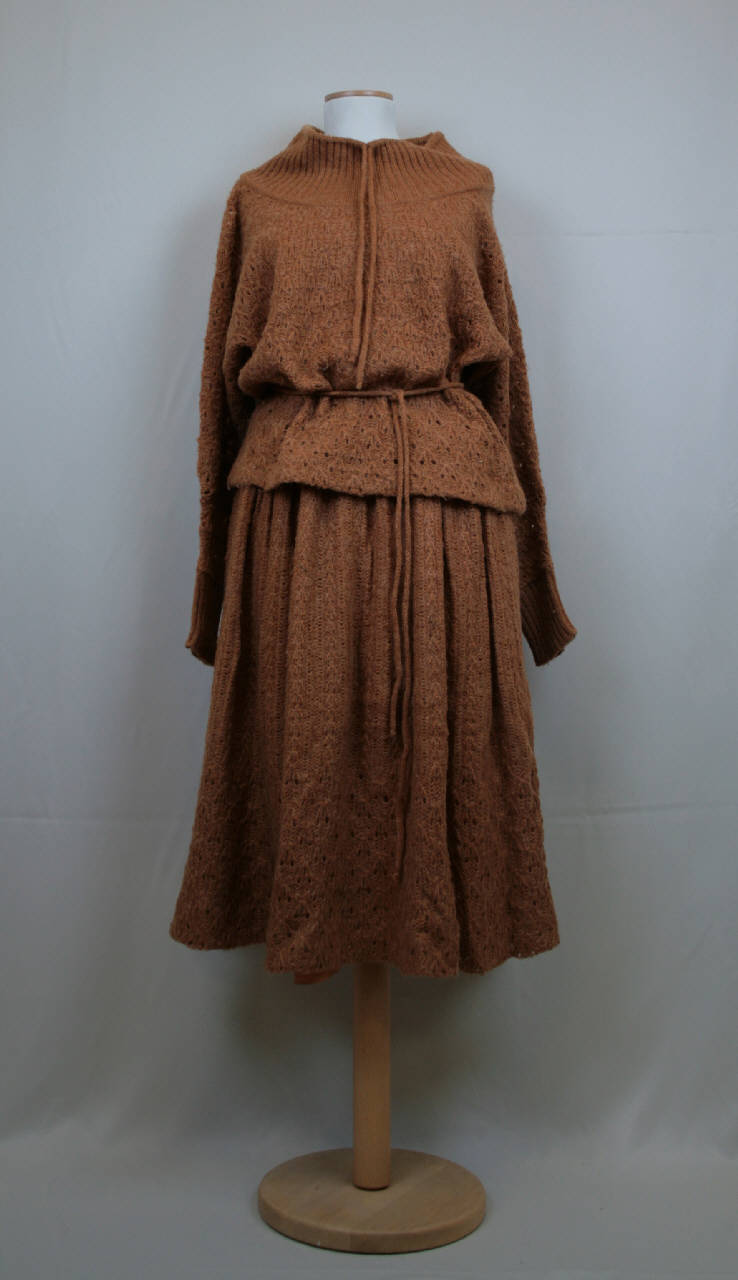 Completo femminile in due pezzi: maglia e gonna in mohair nocciola decorata con motivi traforati. Maglia con alto collo ad anello, terminante con una coulisse, con attaccatura molto bassa, maniche lunghe a chimono con alto polso a coste. Gonna al ginocchio, svasata, con cintura a coste e motivo traforato disposto sull'orlo. Fodera in taffetas senape. Etichetta sulle spalle e sulla cintura.