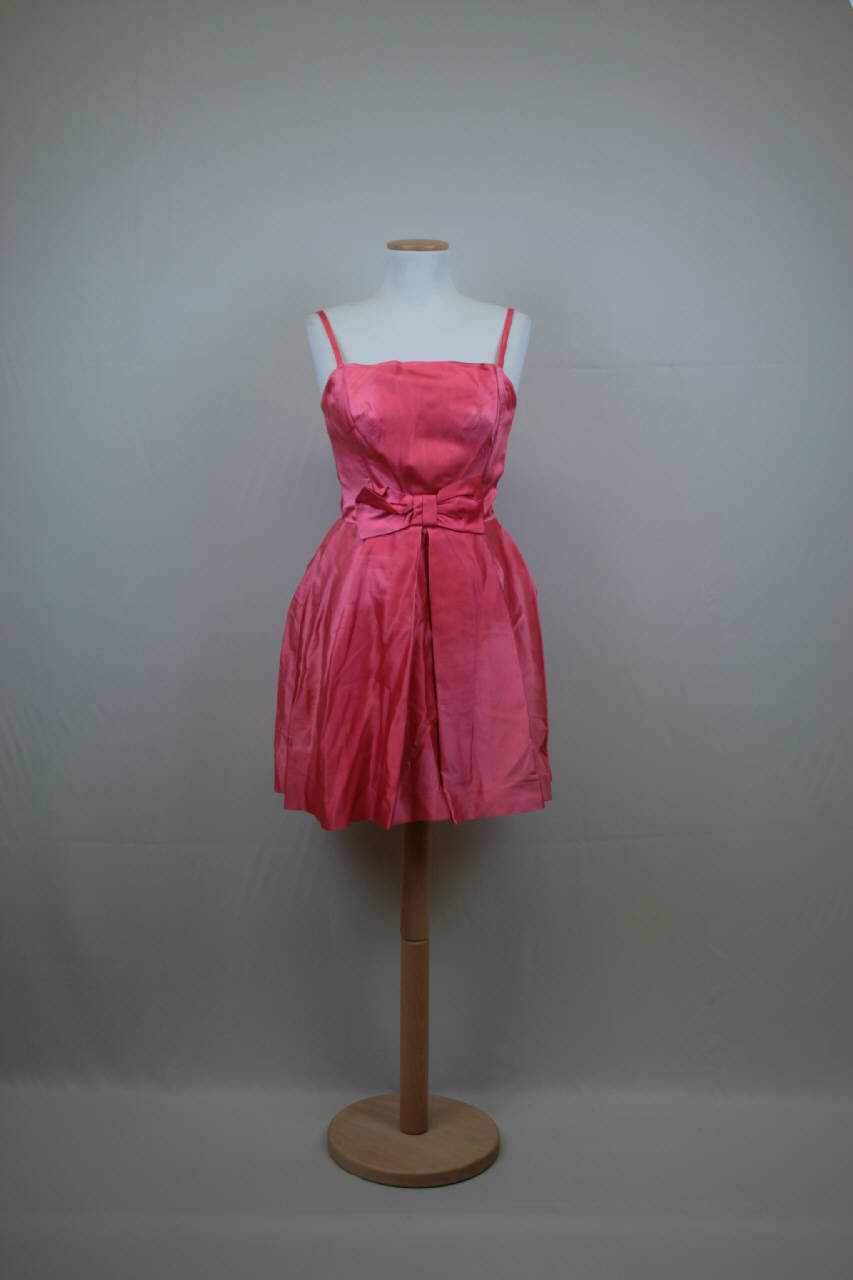 Abito corto al ginocchio in raso color rosa carico, scollo totale, sorretto da due spallini molto sottili, impreziosito da pannello che crea un lieve drappegio a goccia, busto sagomato da tagli e pinces, con taglio in vita da cui parte la gonna svasata e resa morbida da profonde pieghe. Anteriormente, sulla vita è posto un grande fiocco. Sul rovescio sono cucite quattro stecche e, al punto vita, una alta fascia che cinge i fianchi. Chiusura definita da una cernierainserita nella cucitura centrale posteriore e da una coppia di ganci.