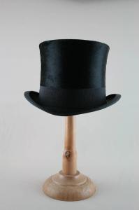 Cilindro in feltro di castoro nero, cinturino in gros nero, impiegato anche per bordare la tesa arricciata; alta fascia interna in gros. Interno foderato in carta su cui è impresso il marchio