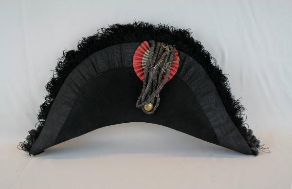 Bicorno o feluca in feltro nero con calotta a due ali rialzate, guarnite con piume di struzzo nere e un nastro in taffetas nero marezzato; ornamento definito da patta in canutiglia dorata con bottone con croce di S. Maurizio e coccarda in gros di seta bianca e rossa. Nastro in pelle scamosciata sul giro d'entrata e fodera in gros bianco.