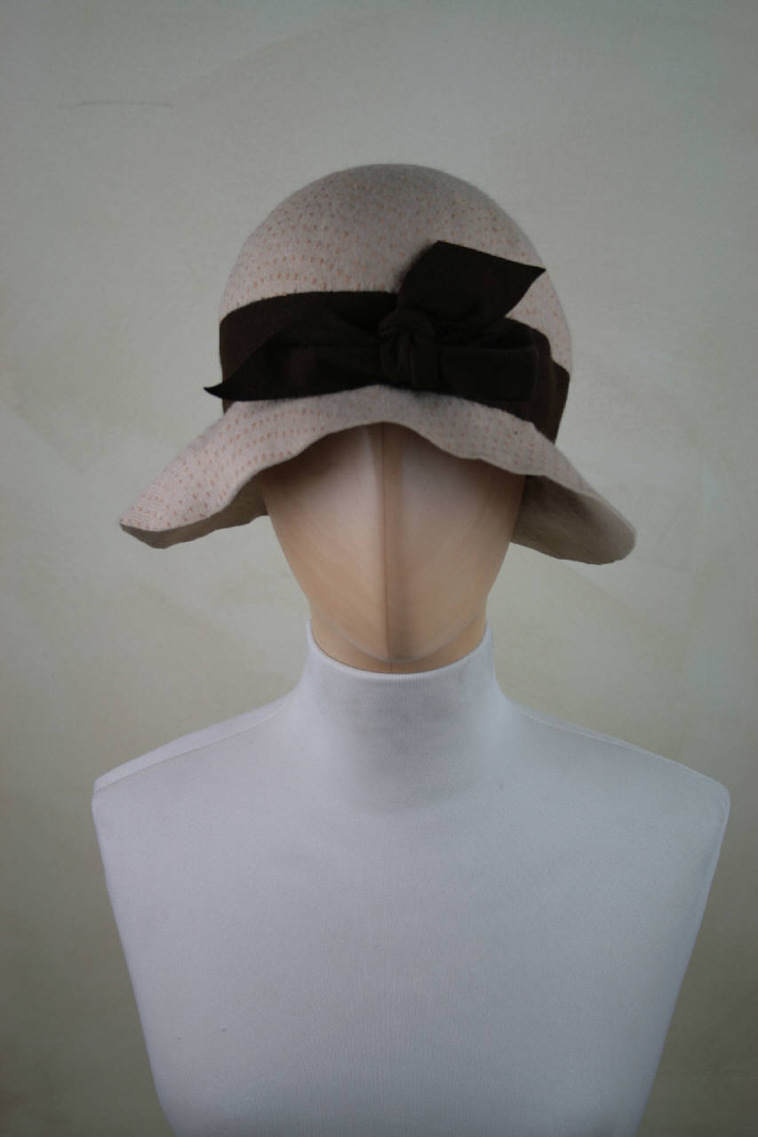 Cloche in feltro avana su cui è stato applicato uno strato di tulle, alto cinturino in feltro marrone che crea un fiocco sul davanti; nastro in gros grigio posto lungo il giro d'entrata; frammenti di fodera in taffetas tortora.