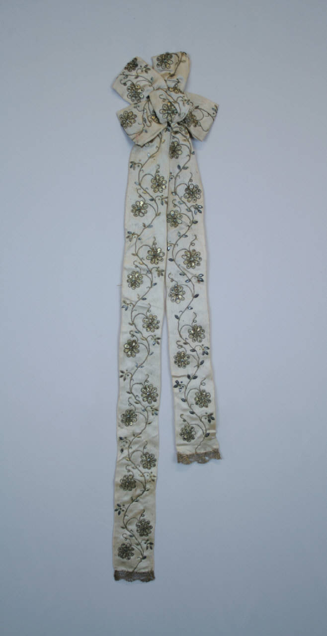 Coccarda confezionato con un nastro in raso avorio con fiocco e due bande, decorati da un sinuoso tralcio fiorito in oro riccio, paillettes e elementi ovoidali; orli rifinito con un merletto dorato decorato da piccoli ventaglietti.