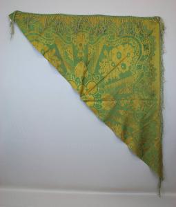 Scialle in origine quadrangolare, di cui è conservato uno spicchio tringolare. Il decoro è dato dalle slegature delle trame gialle sugli orditi verdi, per creare un motivo di uno scialle in pizzo. Entrambi gli orli sono rifiniti con una frangia in seta verde a tre ranghi.