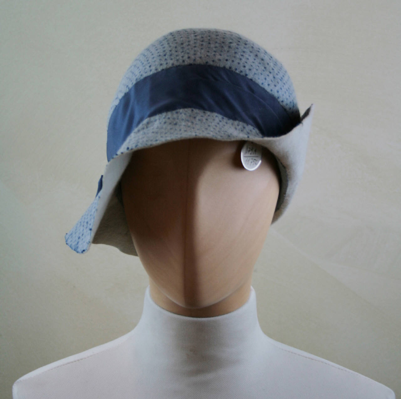 Cloche in feltro celeste su cui è applicato uno strato di tulle, alto cinturino in taffetas blu con grande fiocco sul lato destro; tesa ovoidale rialzata sul lato siniatro ; nastri in gros grigio e blu posti lungo il giro d'entrata.