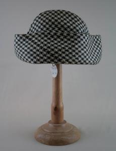 Breton realizzato in paglia bianca e nera intrecciata in armatura saia 3/1 ricreando l'effetto pied de poule. Calotta rotonda modellata da cuciture; alta tesa sollevata; nastro in gros nero, su cui è cucita l'etichetta, sul giro d'entrata. Internamente la calotta è sostenuta da tulle nero.