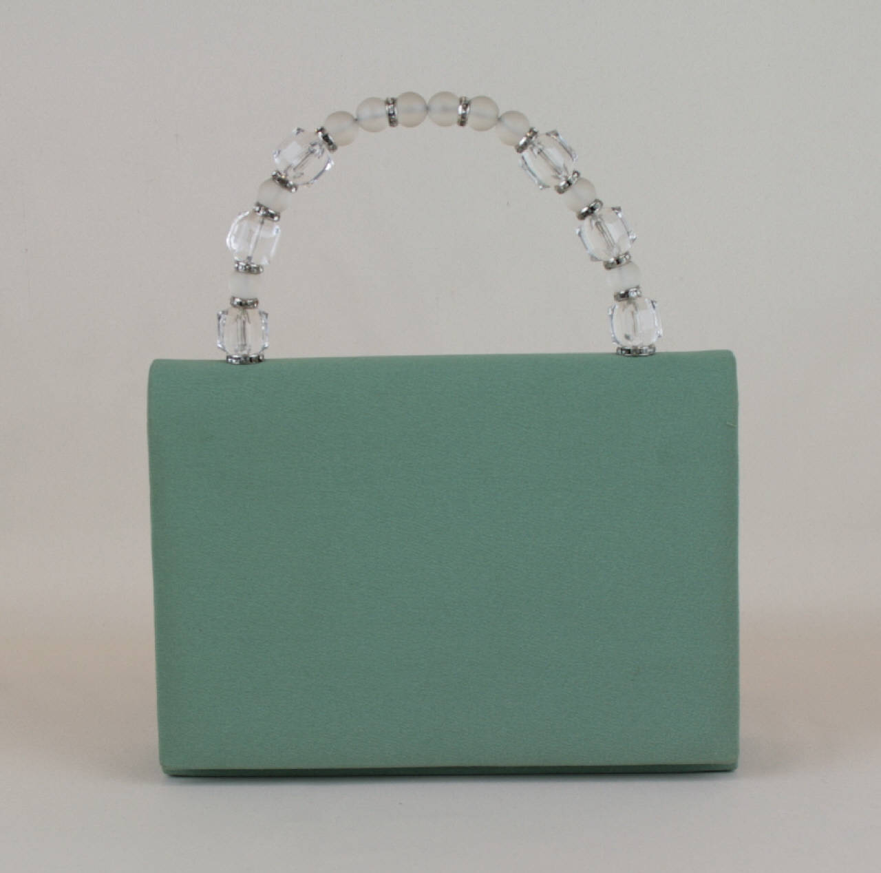 Borsa rigida rivestita in crespo di seta verde, soffietti laterali, base rettangolare, patta rettangolare che arriva fino alla base, chiusura a pressione, manico rigido semicircolare decorato con una successione di finte pietre opache e trasparenti; interno foderato in pelle bianca con tasca applicata; il nome della ditta è inciso su una placchetta metallica posta al di sotto della patta.