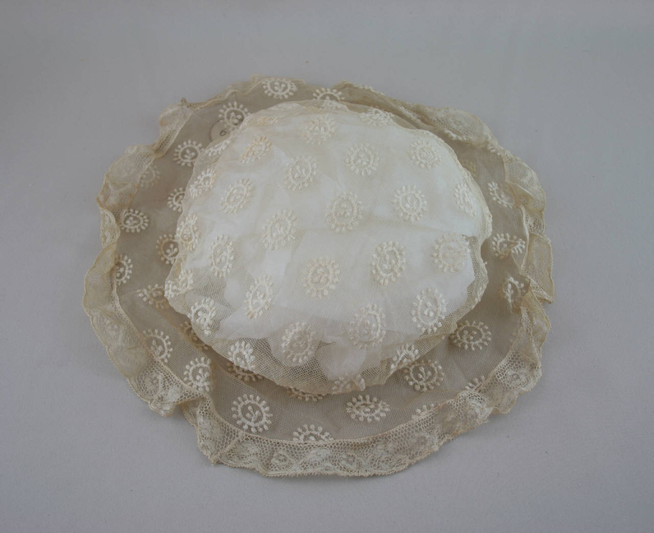 Cuffia con calotta in taffetas di seta avorio ricamata al centro con un scacchiera eseguita a punto a giorno; in ogni riquadro ora è posta una perla; la calotta è rifinita con un alto bordo dove sono cucite cinque coccarde; al bordo è unito un alto bordo in cotone con motivi floreali stilizzati.