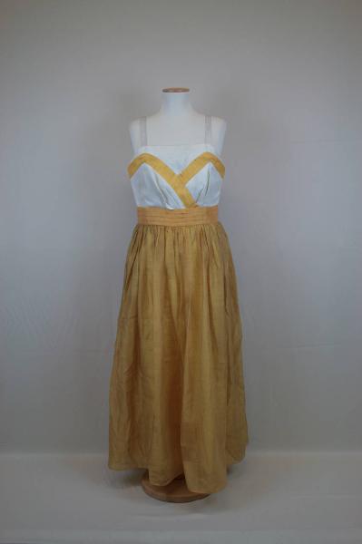 Abito lungo in taffetas bianco effetto shantung, con scollo totale sostenuto da sottili spallini,con taffetas giallo effetto shantung è stato creato l'effetto di uno scollo sagomato a sottabito incrociato; motivo di alta cintura con pieghe piatte orizzontali in vita, a cui si unisce la gonna arricciata in taffettas effetto shantung giallo; sul dorso è presente la cucitura centrale, dov'è inserita la cerniera. Fodera in taffetas bianco per il busto e in taffetas giallo per la gonna. Sulla fodera sono applicate le etichette del marchio e quella della materia (acetato e poliestere).