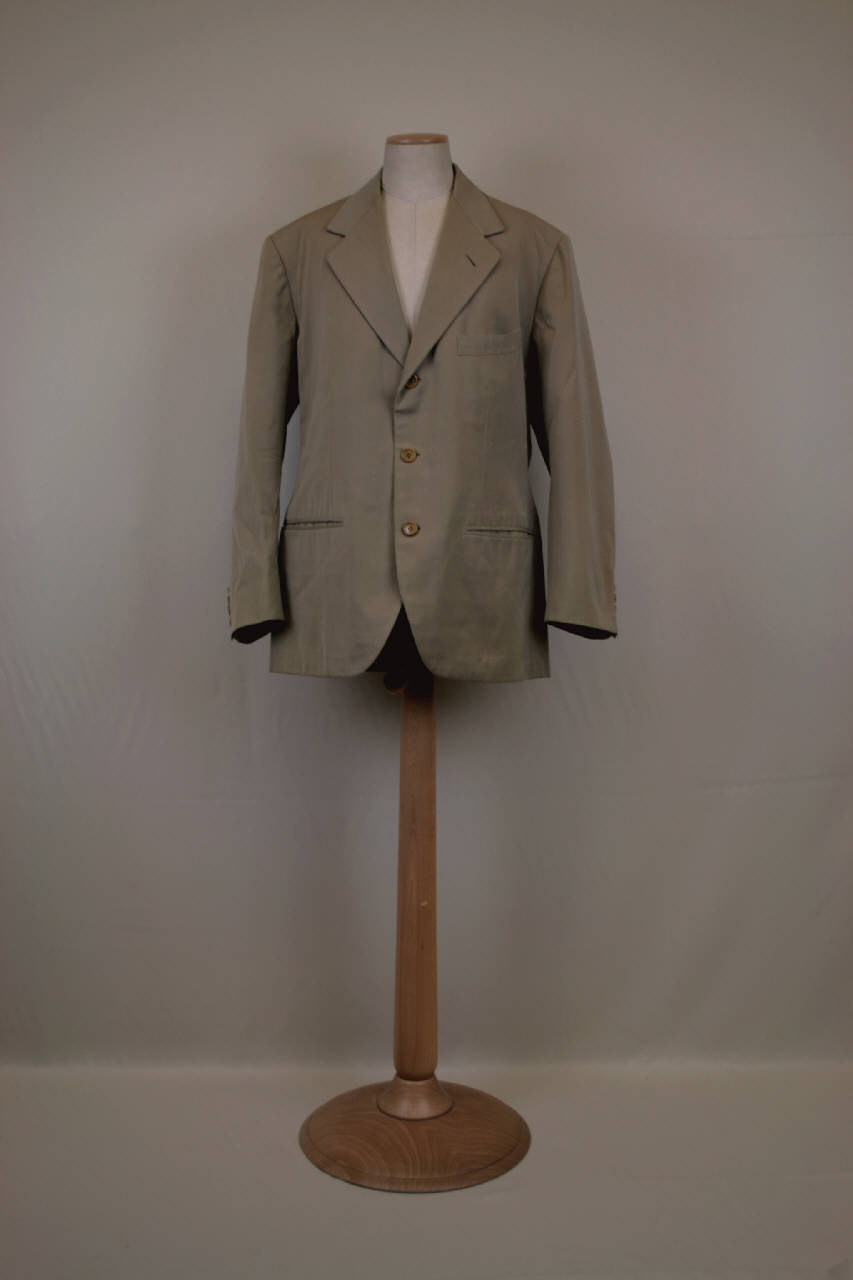 Completo in diagonale di lana color beige, composto da giacca e pantaloni. Giacca monopetto, tre bottoni e tre occhielli, collo con risvolti con occhiello,due tasche a filetto e una con patta cucita; modellata da pinces; dorso con cucitura centrale; maniche in due pezzi con spacco sul fondo con quattro bottoni e altrettanti occhielli. Tasca interna a filetto, dove è posta l'etichetta, fodera in diagonale beige e in taffetas bianco per le maniche. Pantaloni lunghi classici, con risvolto, vita con cintura con passanti, di cui uno metallico, quattro pieghe aperte, chiusura nascosta mediante patta dove sono quattro bottoni e altrettanti occhielli, un altro bottone è all'altezza della vita, una tasca sul lato sinistro, sotto la cintura, tasche inserite nella cucitura dei fianchi; sul dorso quattro pinces chiuse e due tasche a filetto con bottoni. Sul rovescio, all'altezza della vita, foderata in taffetas, sono applicati sei bottoni e, sulla fodera della tasca in tela di cotone, l'etichetta.