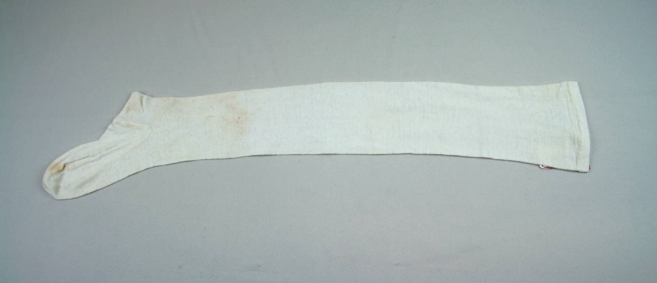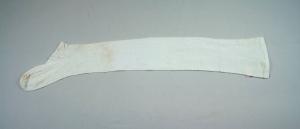 Calze lunghe in cotone bianco con baghetta, bordo superiore ripiegato. Vicino al bordo è presente un timbro.