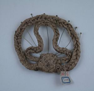 Acconciatura in paglia intrecciata, imitante dei capelli, su struttura in fil di ferro, che definisce un motivo trilobato inserito entro una cornice circolare; alcuni spilli permettono di puntare l'opera.