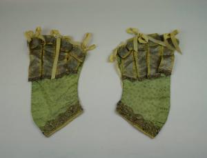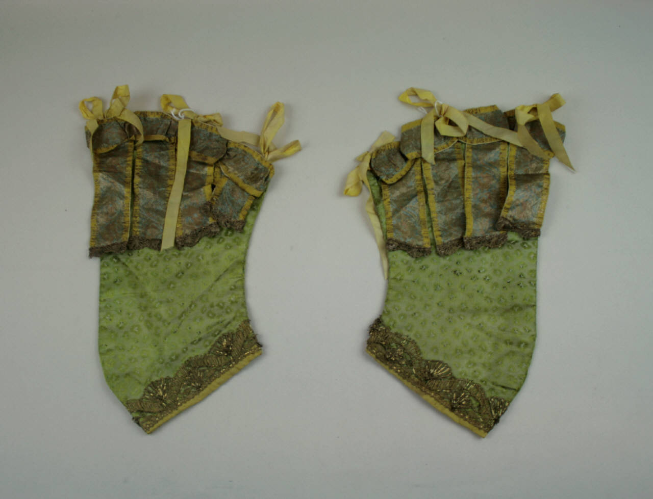 Coppia di maniche in due pezzi, a tre quarti, sagomate. Confezionate in raso liserè lanciato: sul fondo verde quadrettato di bianco, si stagliano dei motivi a macchia in raso verde che incorniciano motivi bianchi e neri; il decoro è dato dalla slegatura della trama nera e dalla trama lanciata bianca. Sulla pala sono applicati tre fiocchi e quattro bande, create da galloni in taffetas di seta gialla, decorate con motivi vegetali stilizzati definiti da orditi di pelo azzurri e trame in oro lamellare, e, inserite entro occhielli circolari, tre fettucce in taffetas di seta gialla, impiegato anche per rifinire il bordo della manica, su cui corre un merletto a fuselli in oro filato e lamellare, decorato da un motivo a ventaglietti. Doppiata in tela di lino rosa.