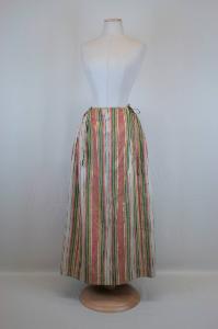 Gonna lunga svasata in taffetas di seta rigata ( trama rosa e orditi rosso, giallo verde, blu, bianco). La gonna è confezionata con 5 teli, uno per la faccia anteriore e 4 per il dorso, Sottile cintura in vita, doppiata in taffetas verde, che, sul retro, trattiene una ricca pieghettatura; aperture sui fianchi che consentono l'indosso del capo, chiuse grazie a fettucce e cordoncini (materiali di recupero). Orlo rafforzato con una banda in tela di lino marrone.