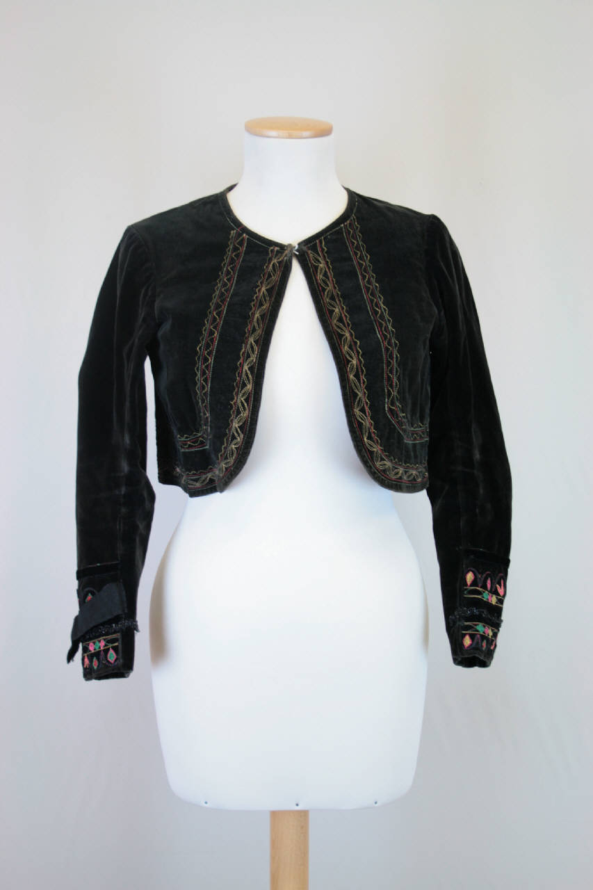 Bolero in velluto tagliato nero, scollo a girocollo, apertura centrale anteriore molto stondata, maniche lunghe dritte in due pezzi; allacciatura creata da coppia di ganci. L'apertura, l'orlo e il polso sono sottolineati con un ricamo in cotone policromo a macchina che disegna una motivo a zig-zag ; la parte terminale delle maniche è invece contraddistinta da un ricamo più ricco, definito da foglioline policrome e da perline nere. La parte anteriore è foderata con diagonale di cotone con motivi scozzesi (nero, arancio e verde); il retro con un pekin di cotone nocciola e avorio; per le maniche tela di cotone quadrettata (rosso e blu) con piccole stelle eseguite con la slegatura della trama, unitamente a frammenti di tela di cotone quadrettata (rosso e verde).