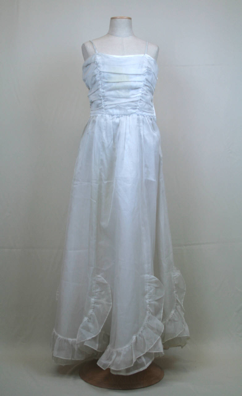 Abito lungo in organza bianca, doppiato in taffetas bianco, scollo totale sostenuto da sottili spallini, busto drappeggiato e tagliato in vita, dove si unisce la gonna svasata e arricciata che termina con volant. Coppia di passanti cuciti ai fianchi. Il corpino è foderato in organza, dove, sotto il seno, è stato cucito un elastico. Chiusura ottenuta da una cernierainserita sul fianco destro.