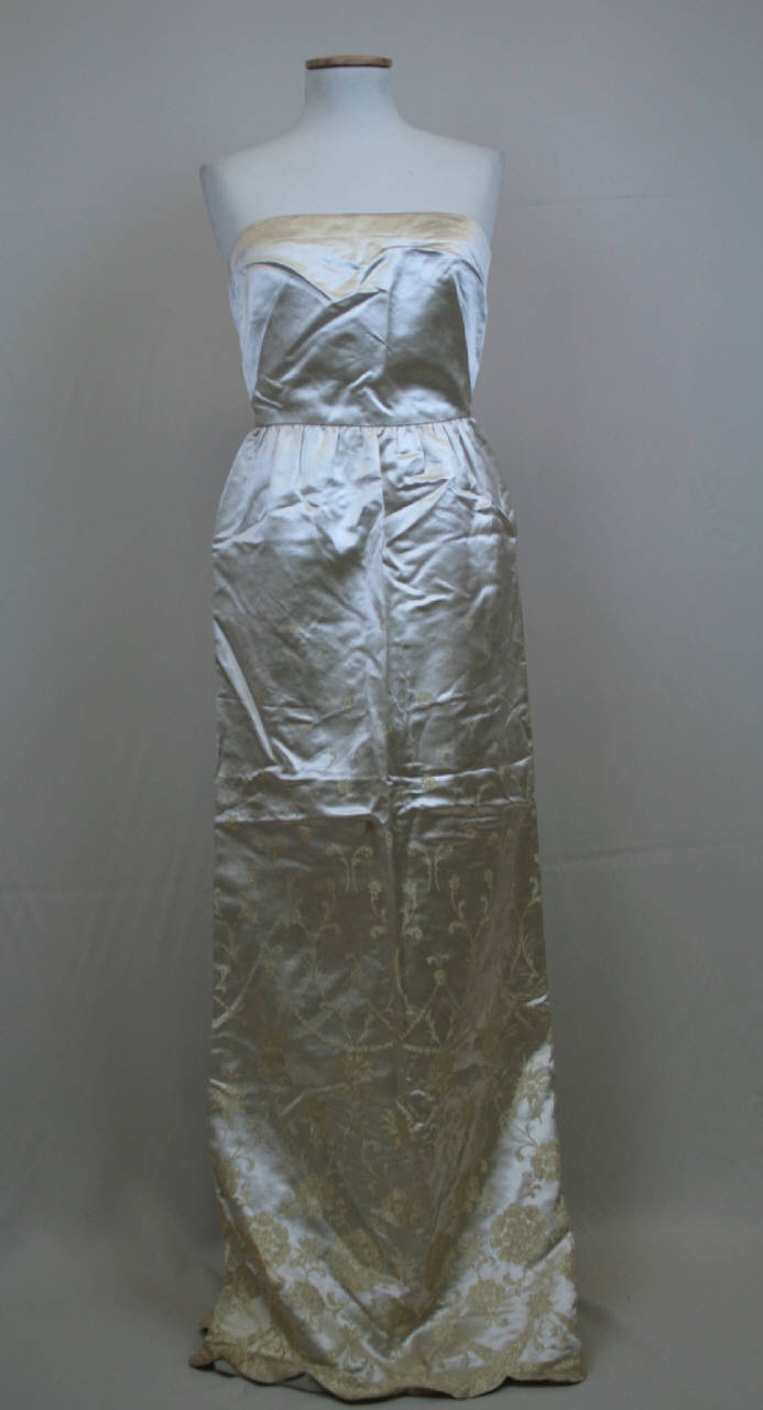 Abito lungo in raso avorio decorato, sull'orlo, da tralci floreali creati da una trama metallica. Scollo totale dritto, busto modellato da pinces al seno, taglio in vita a cui si unisce la gonna dritta, con una lieve arricciatura. Fodera in taffetas avorio molto sottile. Chiusura ottenuta da una cernierainserita nella cucitura centrale posteriore che termina con uno spacco.